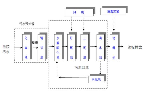 醫院一體化污水處理設備工藝,醫院污水經過格柵后自流入調節池,用污水泵將污水提升進入生物接觸氧化池,順序自流入二沉池和接觸消毒池后達標排放。