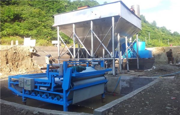 砂石場泥漿脫水機經過提升泵提升到污泥速沉罐中,在污泥速沉罐里加入絮凝劑迅速使水和泥沙的分離,沉淀后污泥送到帶式壓濾機里面進行固液終端分離,泥餅外運,實現封閉循環使用,無任何污染外排。