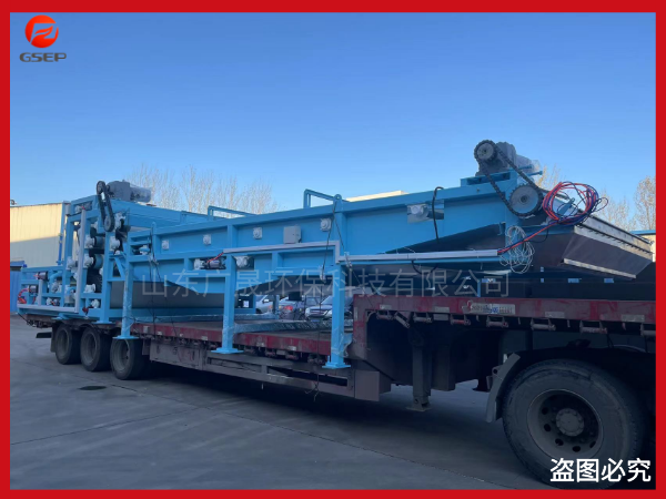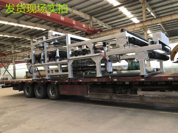 在重力的作用下自由水透過濾網(wǎng)背面而滲出分離,形成不流動狀態(tài)的泥漿,達(dá)到壓榨脫水區(qū)實施較大壓力條件,然后隨著網(wǎng)帶的移動而夾持在上下兩條網(wǎng)帶之間,經(jīng)過具有可調(diào)張緊力的過濾帶及直徑逐漸遞減的轉(zhuǎn)輥和對壓輥,實施連續(xù)增加的緩慢的對輥擠壓力、剪切力作用。