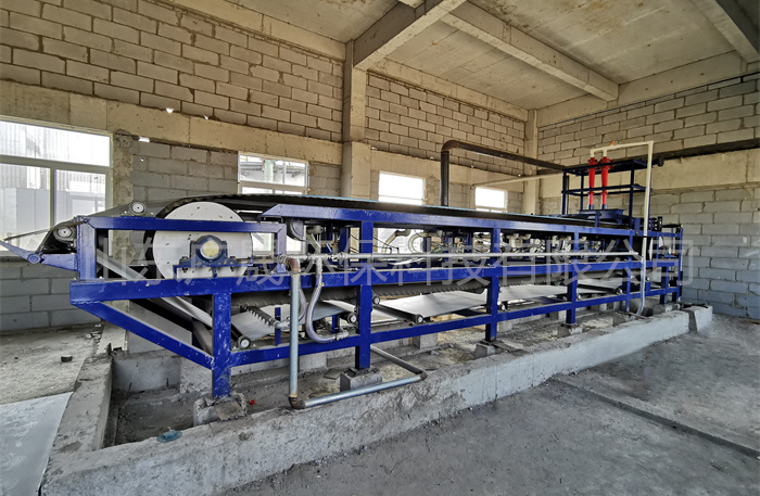 真空帶式連續過濾機是在引進國外同類產品技術基礎上,開發的一種過濾固液分離設備。該設備采用了固定真空盒,膠帶在真空盒上滑動,真空盒與膠帶間構成運動密封的結構型式,以真空負壓為推動力實現固液分離的設備。在結構上,過濾區段沿水平長度方向布置,能連續自動完成過濾、濾餅洗滌、卸渣、濾布再生等工藝操作,并且母液有與濾餅洗滌液可以分段收集。具有過濾效率高、生產能力大、洗滌效率好,濾餅水分低、操作靈活、維護簡單等優點。全自動真空帶式過濾機以濾布為過濾介質,是充分利用物料重力和真空吸力實現固液分離的高校分離設備。采用整體的環形橡膠帶作為真空室。環形膠帶由電機拖動連續運行,濾布鋪在膠帶上與之同步運行,膠帶與真空滑臺上環形摩擦帶接觸并形成水密封。料漿由布料器均勻地布在濾布上。當真空接通真空系統時,在膠帶上形成真空抽濾區,濾液穿過濾布經膠帶上的橫溝槽匯總并由上孔進入真空室,固體顆粒被截留在濾布上形成濾餅。